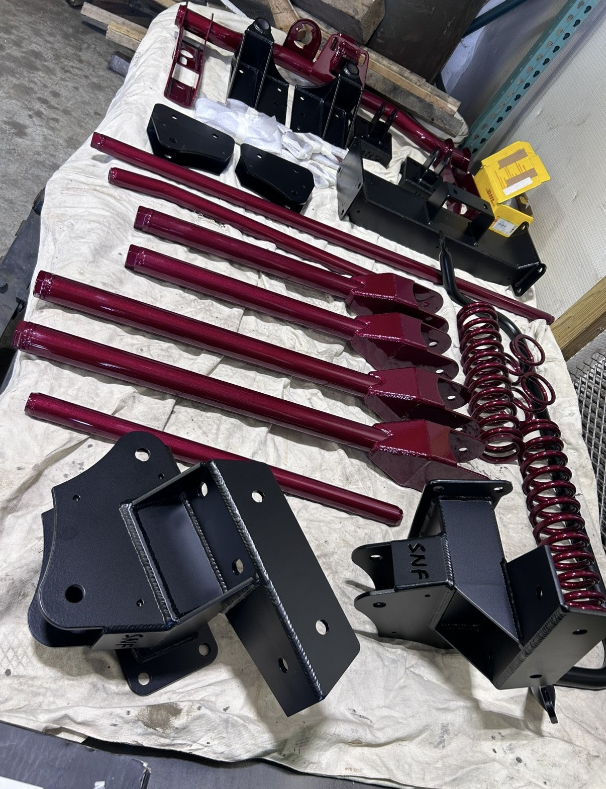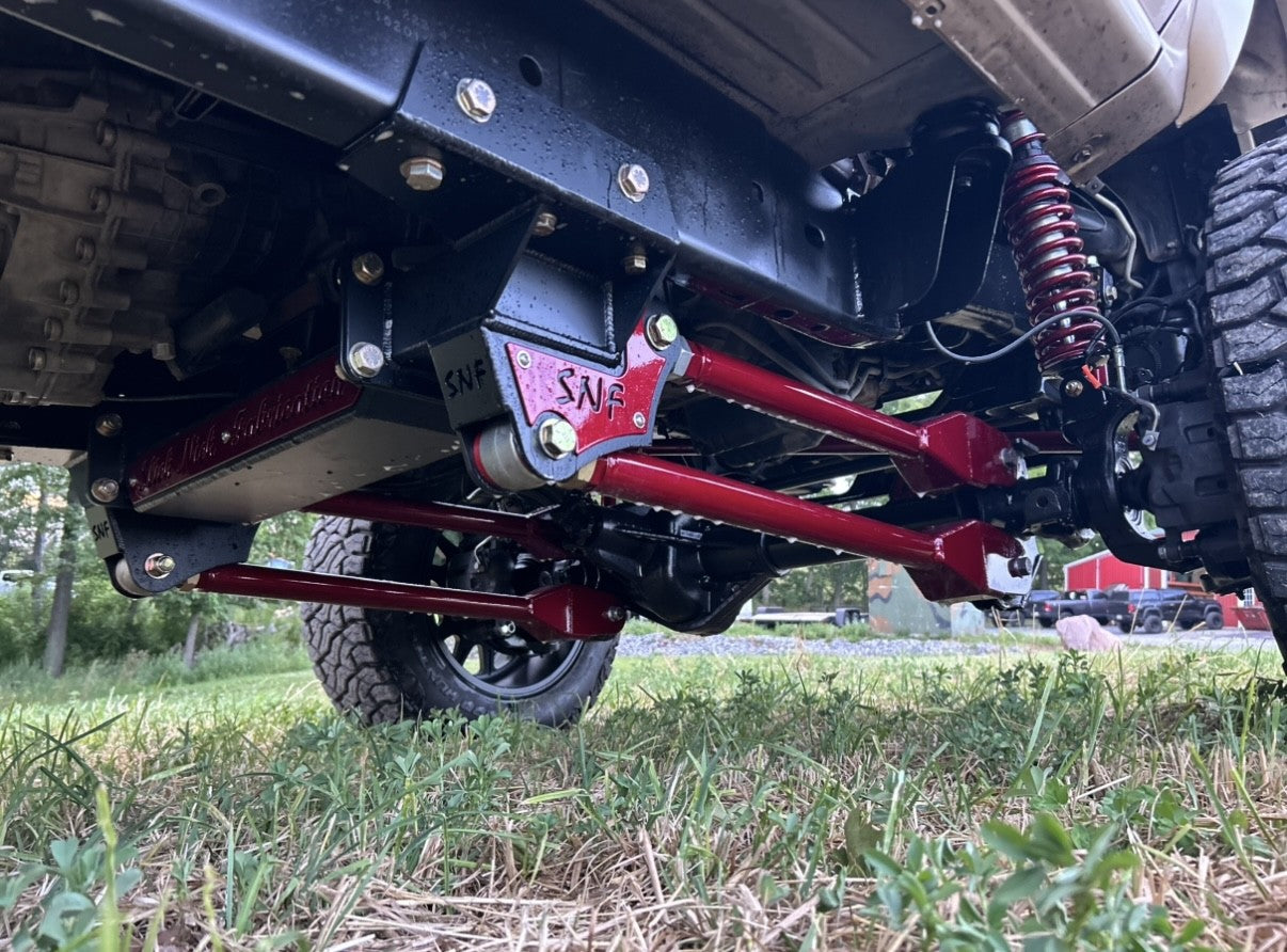 We designed and fabricated this kit to use a 2005+ Ford F250 front axle. This is a 4-link kit that replaces the stock transmission crossmember with this 3 piece design with the 4 link integrated right into it. The kit comes with the following.